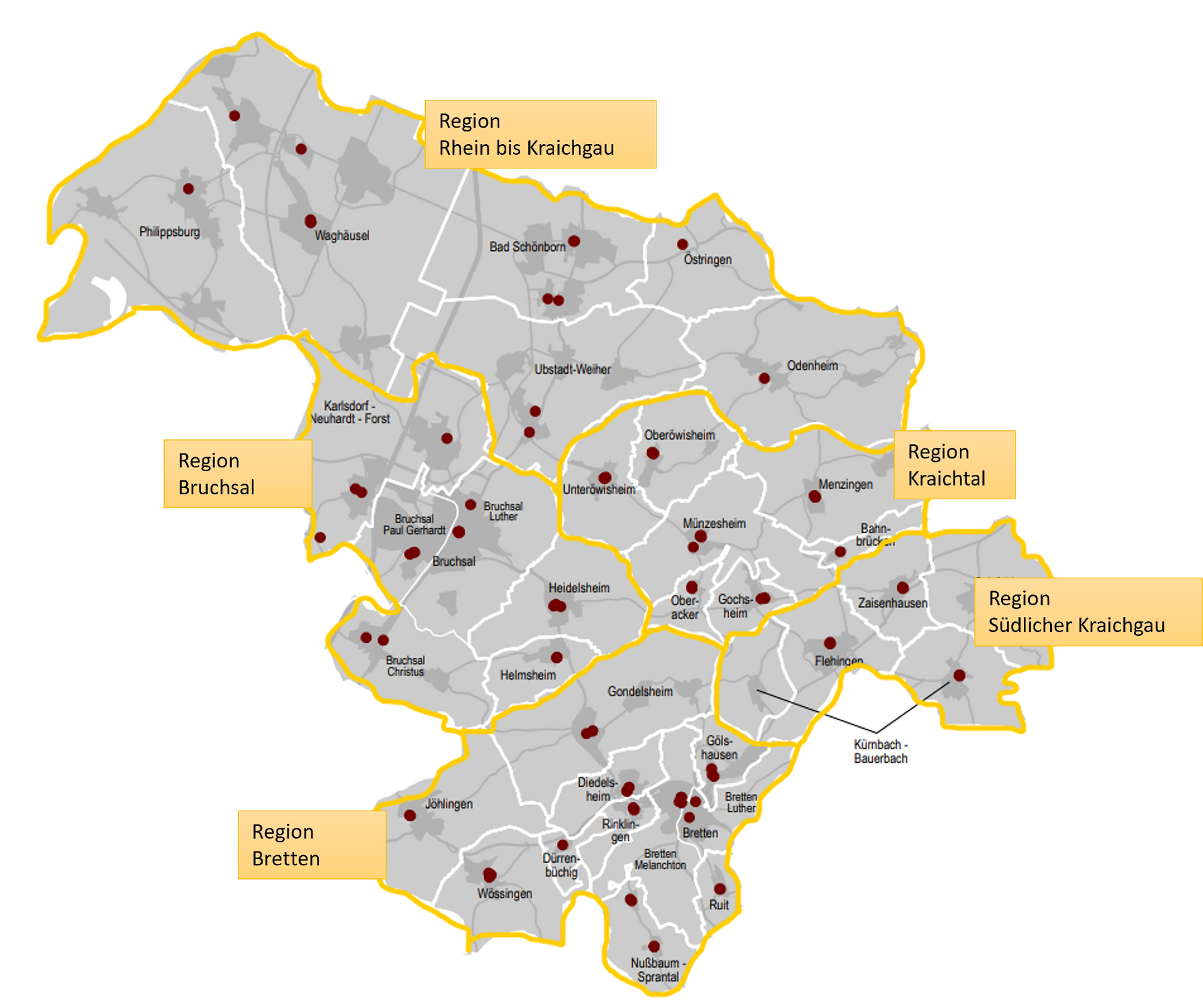Der Evangelische Kirchenbezirk Bretten-Bruchsal besteht aus fünf Regionen: Bretten, Bruchsal, Kraichtal, Rhein bis Kraichgau und Südlicher Kraichgau.