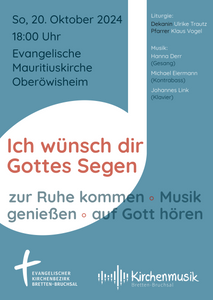 „Zur Ruhe kommen, Musik genießen, auf Gott hören“: Der Evangelische Kirchenbezirk Bretten-Bruchsal lädt ein zum Gottesdienst mit viel Musik am Sonntag, 20. Oktober, um 18 Uhr, in der Evangelischen Mauritiuskirche in Oberöwisheim. Das Motto des Abends ist ein Lied-Titel und lautet: „Ich wünsch dir Gottes Segen“.